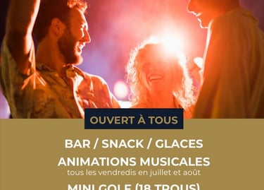 Piscine, mini golf (5€) en période estivale , tennis, volley, ping pong, parc aventurier, baby poney (à partir de 8€).. Concert tous les vendredis soirs